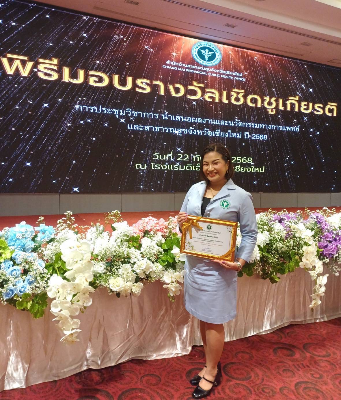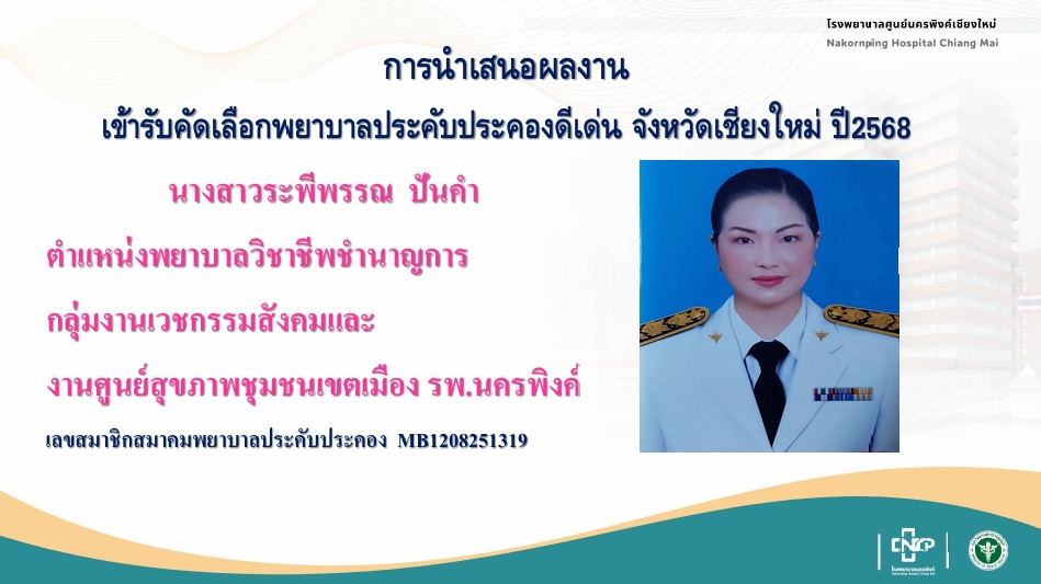 สมาคมศิษย์เก่า วิทยาลัยพยาบาลบรมราชชนนี เชียงใหม่ ขอแสดงความยินดีกับนางสาวระพีพรรณ ปันคำ ตำแหน่งพยาบาลวิชาชีพชำนาญการ กลุ่มงานเวชกรรมสังคมและงานศูนย์สุขภาพชุมชนเขตเมือง รพ.นครพิงค์ ศิษย์เก่ารุ่นที่ 1 ได้รับการคัดเลือกเป็นพยาบาลประคับประคองดีเด่น จังหวัดเชียงใหม่ ประจำปีงบประมาณปี2568 ในพิธีมอบรางวัลเชิดชูเกียรติ การประชุมวิชาการ นำเสนอผลงานและนวัตกรรมทางการแพทย์และสาธารณสุขจังหวัดเชียงใหม่ ปี 2568 วันที่ 22 กันยายน 2568 ณ โรงแรมดิเอ็มเพลส เชียงใหม่