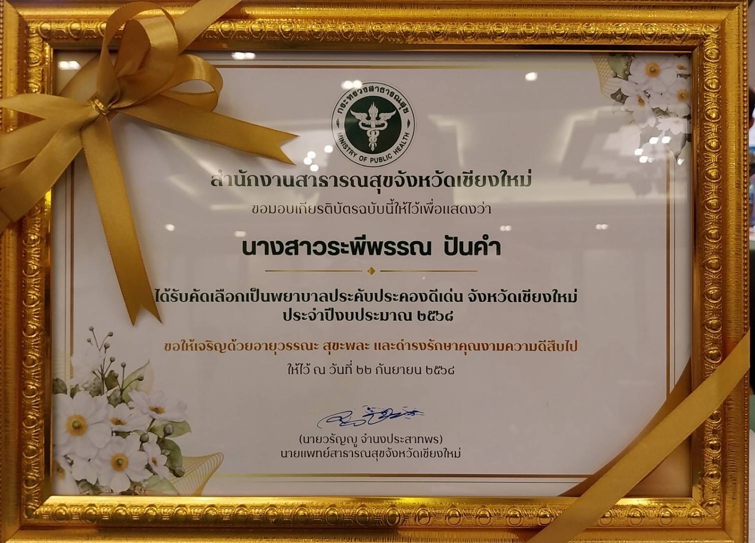 สมาคมศิษย์เก่า วิทยาลัยพยาบาลบรมราชชนนี เชียงใหม่ ขอแสดงความยินดีกับนางสาวระพีพรรณ ปันคำ ตำแหน่งพยาบาลวิชาชีพชำนาญการ กลุ่มงานเวชกรรมสังคมและงานศูนย์สุขภาพชุมชนเขตเมือง รพ.นครพิงค์ ศิษย์เก่ารุ่นที่ 1 ได้รับการคัดเลือกเป็นพยาบาลประคับประคองดีเด่น จังหวัดเชียงใหม่ ประจำปีงบประมาณปี2568 ในพิธีมอบรางวัลเชิดชูเกียรติ การประชุมวิชาการ นำเสนอผลงานและนวัตกรรมทางการแพทย์และสาธารณสุขจังหวัดเชียงใหม่ ปี 2568 วันที่ 22 กันยายน 2568 ณ โรงแรมดิเอ็มเพลส เชียงใหม่